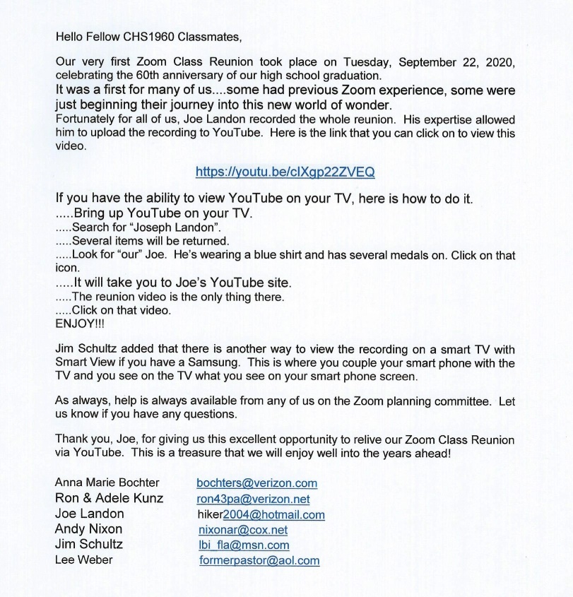 LINK TO VIDEO - ZOOM 60th VIRTUAL CLASS REUNION - SEPTEMBER 22, 2020